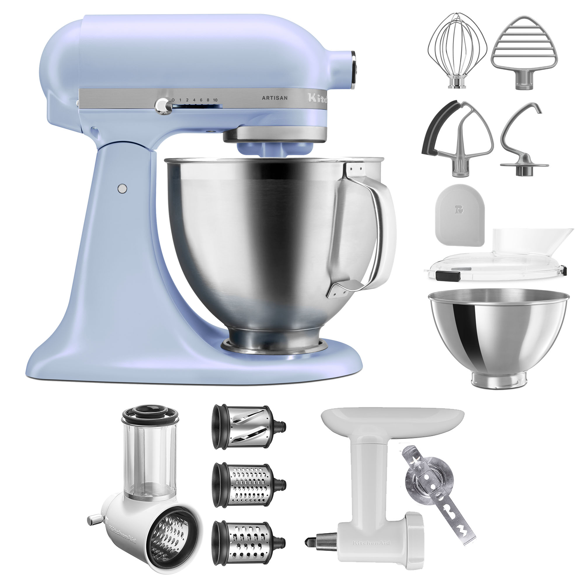Das meist verkaufte Zubehör, der Gemüseschneider 5KSMVSA, ein echter Profi, wenn es darum geht die große Vielfalt an Gemüse, wie Paprika, Gurken und andere Gemüsesorten für einen leckeren Fitnesssalat zu raspeln oder süßes Obst, wie Äpfel für einen leckeren Apfelkuchen zu schneiden. Aber nicht nur Karotten und Co. können mit dem Gemüseschneider verarbeitet werden, sondern auch Käse für ein leckeres Gratin, Nüsse für die Knabbermischung und Schokolade zum Backen.